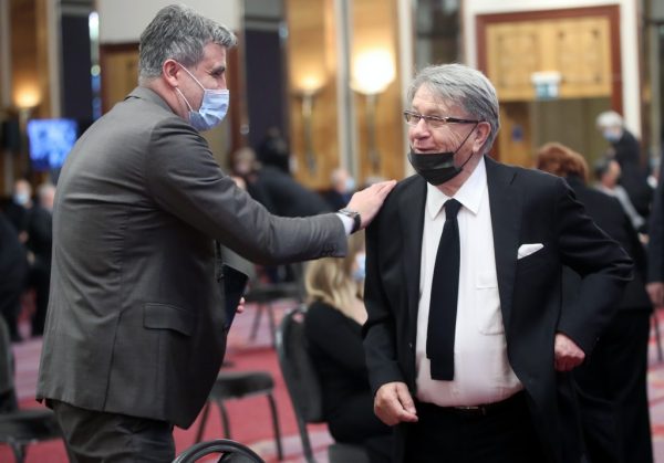 Zagreb, 5.3.2021.- Komemoracija igraèu i treneru GNK Dinamo Zlatku Kranjèaru odrana je u zagrebaèkom hotelu Westin. Na slici Zoran Mamiæ i Miroslav Æiro Blaeviæ.