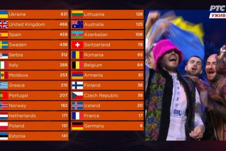 Iako će neki gledati ovu pobjedu kao političku, bitno je napomenuti da su upravo gledatelji „krivi“ za ukrajinsku pobjedu. Naime, Ukrajina je bila četvrta u poretku žirija, ali su zahvaljujući glasovima publike, koja im je dodijelila čak 439 bodova, uvjerljivo pobjedili. Prvo prema ocjenama žirija je osvojio predstavnik Ujedinjenog Kraljevstva Sam Ryder, koji je na kraju završio drugi, više od 150 bodova iza Ukrajine. Treće mjesto osvojila je Španjolska, a top 5 su zaokružile predstavnica Švedske, Cornelia Jakobs i predstavnica Srbije, Ana Đurić Konstrakta.