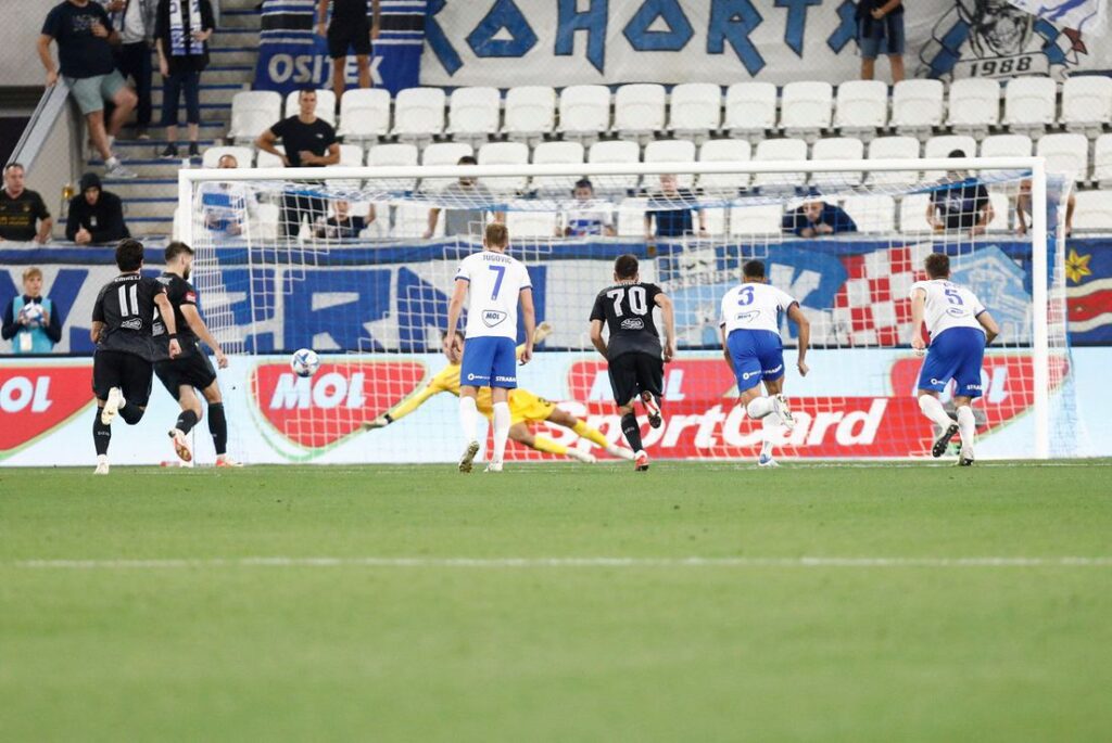 U 29. minuti vidjeli smo još jednu veliku priliku za Osijek. Lovrić je asistirao Miji Caktašu, a trenutno prvi strijelac HNL-a sa nekih 11 metara nije uspio najbolje reagirati, lopta mu je prešla preko noge.